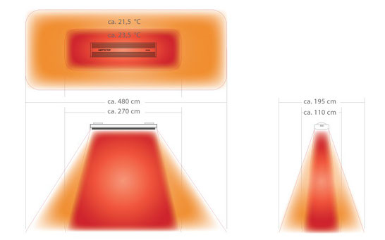 Bei einem Infrarotstrahler ist das Besondere, dass alle in der Neigung angestrahlten Gegenstände und Personen erwärmt werden. Die Wärmestrahlen sind nicht sichtbar und auch der Wärmestrahler verfärbt sich nicht rot. Bei einem Heizstrahler mit 1800 Watt Leistung ist es möglich bei 2.20 m Montagehöhe bis zu 8 Grad Temperaturunterschied zu erzielen.