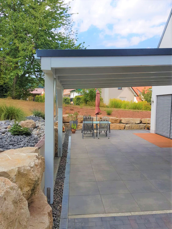 Wir haben bewusst die Überdachung auf der fensterlosen Seite installiert. Die hälfte der Terrasse sollte nach wie vor sonnig sein, die andere Hälfte sollte schattig sein. Genau so ist es geworden.