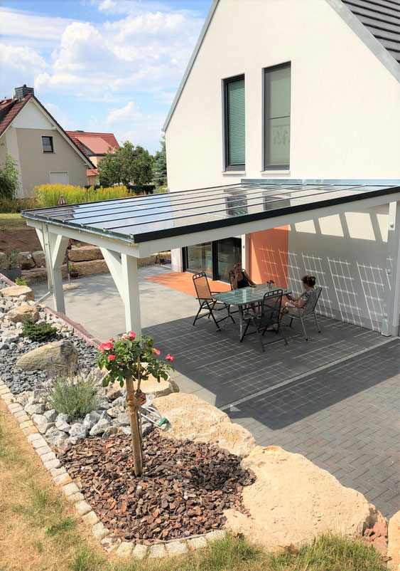 Unsere Terrasse ist direkt auf der Südseite am Haus. Sonnenschirm war eine Möglichkeit, aber alle darunter im Schatten zu haben war unmöglich. Ständig musste der Schirm verrückt werden, da die Sonne auch weiter zieht. Eine feste Überdachung war schon gedanklich in meinem Kopf, die genaue Art und Weise allerdings noch nicht. Im Internet habe ich mir stundenlang abends auf der Couch verschiedene Bilder und Möglichkeiten angesehen und wir waren nach dem Beratungsgespräch sehr zufrieden.